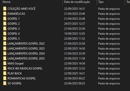 AS PASTAS DE LANÇAMENTOS GOSPEL, CONTA COM OS ANOS 2022, 2023, 2024 E 2025, PODENDO SER ATUALIZADAS ADICIONANDO MAIS MÚSICAS, SIGA NOSSA PÁGINA PARA ACOMPANHAR AS NOVIDADES. ESSAS PASTA ATÉ O MOMENTO, CONTA COM 668 ARQUIVOS GERANDO 5.61GB